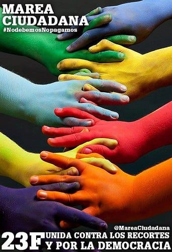 El sábado 23F por la tarde están convocadas las mareas ciudadanas para sumar las reivindicaciones por el desempleo, Sanidad y la Educación públicas, derechos laborales y sociales, medio ambiente y otras mareas de todos los colores que han convocado protestas estos meses con colores blanca, verde, roja, naranja, amarilla, negra, azul, violeta… en defensa de derechos ciudadanos.