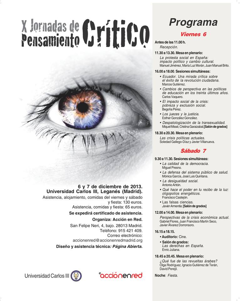 Ya está aquí el programa de las X Jornadas de Pensamiento Crítico, que tendrán lugar los días 6 y 7 de diciembre de 2013, en la Universidad Carlos III (Leganés, Madrid).