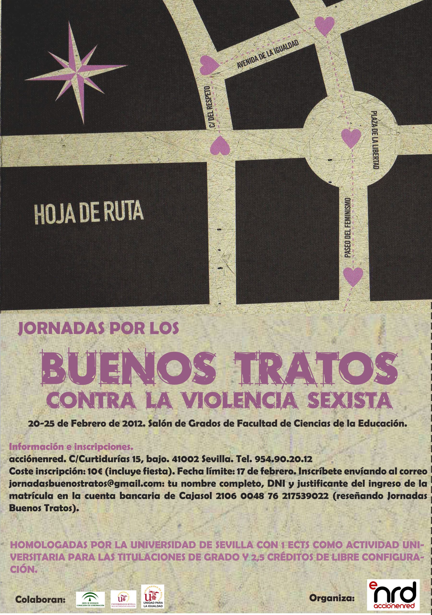Del 20 al 25 de febrero de 2012, en el Salón de Grados de la Facultad de Ciencias de la Educación, se celebrarán en Sevilla las Jornadas "Por los buenos tratos. Contra la violencia sexista", organizadas por acciónenred Sevilla.