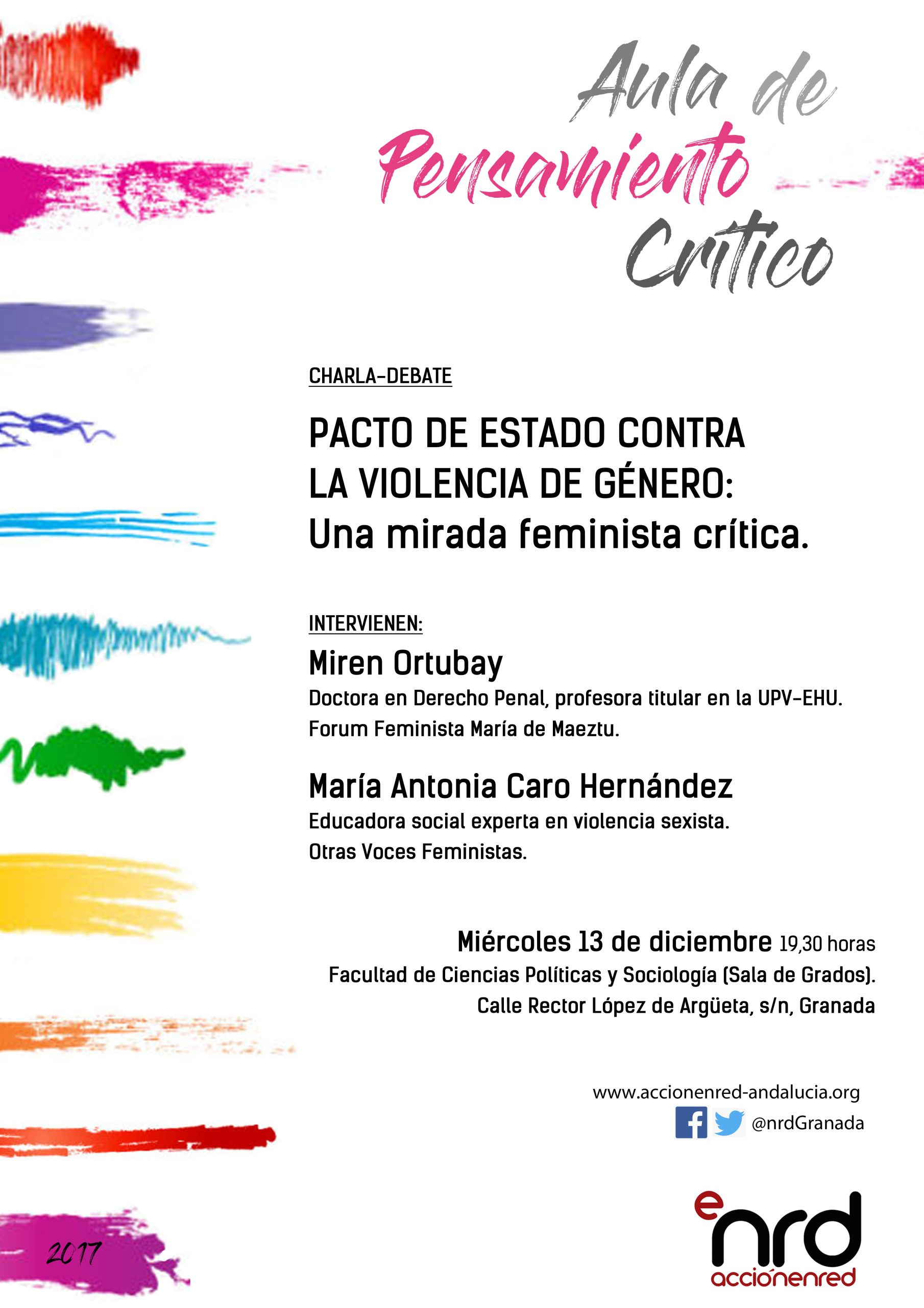 Desde acciónenred ponemos en marcha una nueva edición del Aula de Pensamiento Crítico, que tuvo lugar el  miércoles 13 de diciembre en la Facultad de Ciencias Políticas y Sociología de la UGR. En esta ocasión contamos con Miren Ortubay, doctora en Derecho Penal y profesora titular en la UPV-EHU,  y María Antonia Caro, educadora social y experta en violencia sexista, para profundizar sobre el reciente Pacto de Estado contra la Violencia de Género.