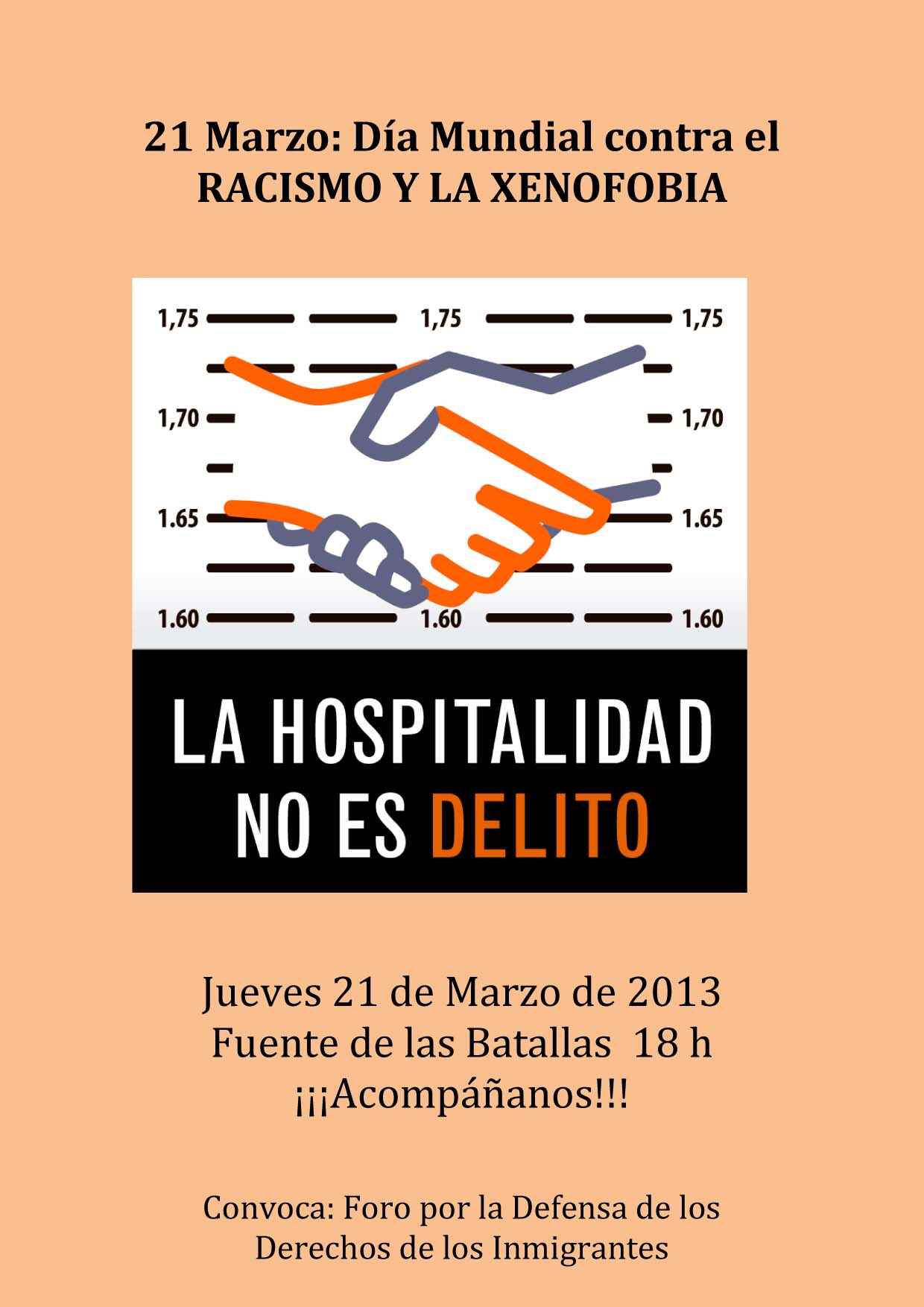 El próximo día 21 de Marzo, Día internacional contra el Racismo y la Xenofobia, el FORO POR LA DEFENSA DE LOS DERECHOS DE LOS INMIGRANTES, en el cual participamos activamente junto a otras asociaciones y colectivos de inmigrantes y pro-inmigrantes, organiza un acto de sensibilización.