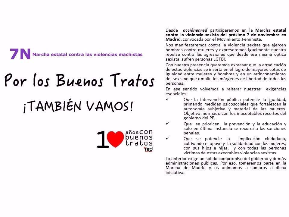 Desde acciónenred participaremos en la Marcha estatal contra la violencia sexista del próximo 7 de Noviembre en Madrid, convocada por el Movimiento Feminista.