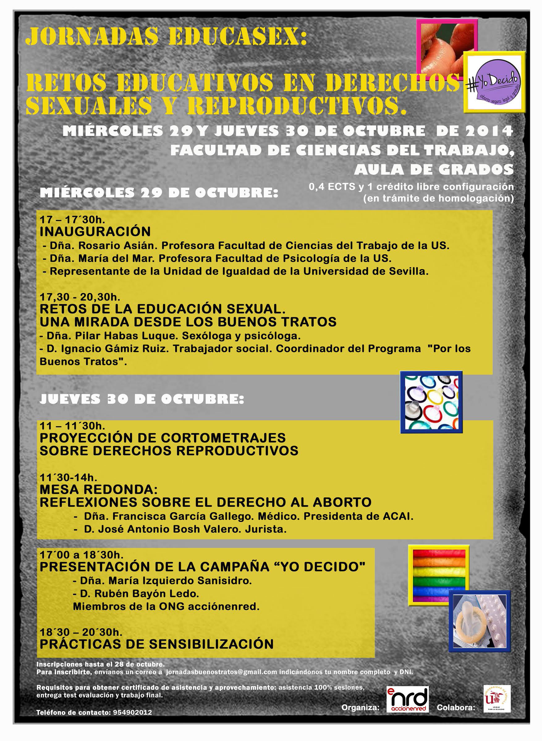 Ya está aquí el programa de las Jornadas Educasex: "Retos educativos en derechos sexuales y reproductivos" que organizamos desde acciónenred Sevilla los días 29 y 30 de octubre en la Facultad de Ciencias del Trabajo (Calle Enramadilla, 18; en Campus Ramón y Cajal).