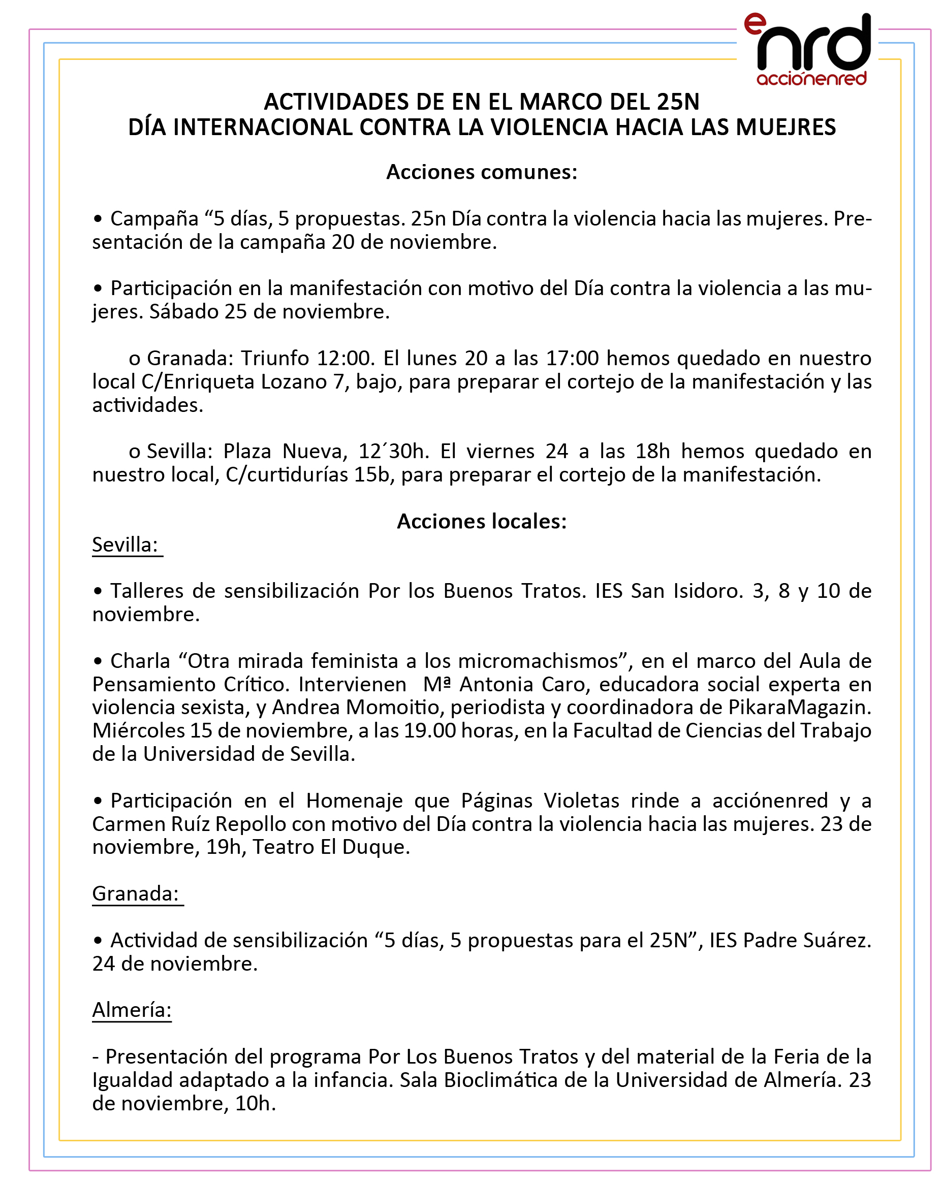 A lo largo de todo el mes de noviembre desde acciónenred-Andalucía ponemos en marcha diversas iniciativas con motivo del Día internacional contra la violencia hacia las mujeres que se conmemora el 25 de noviembre.