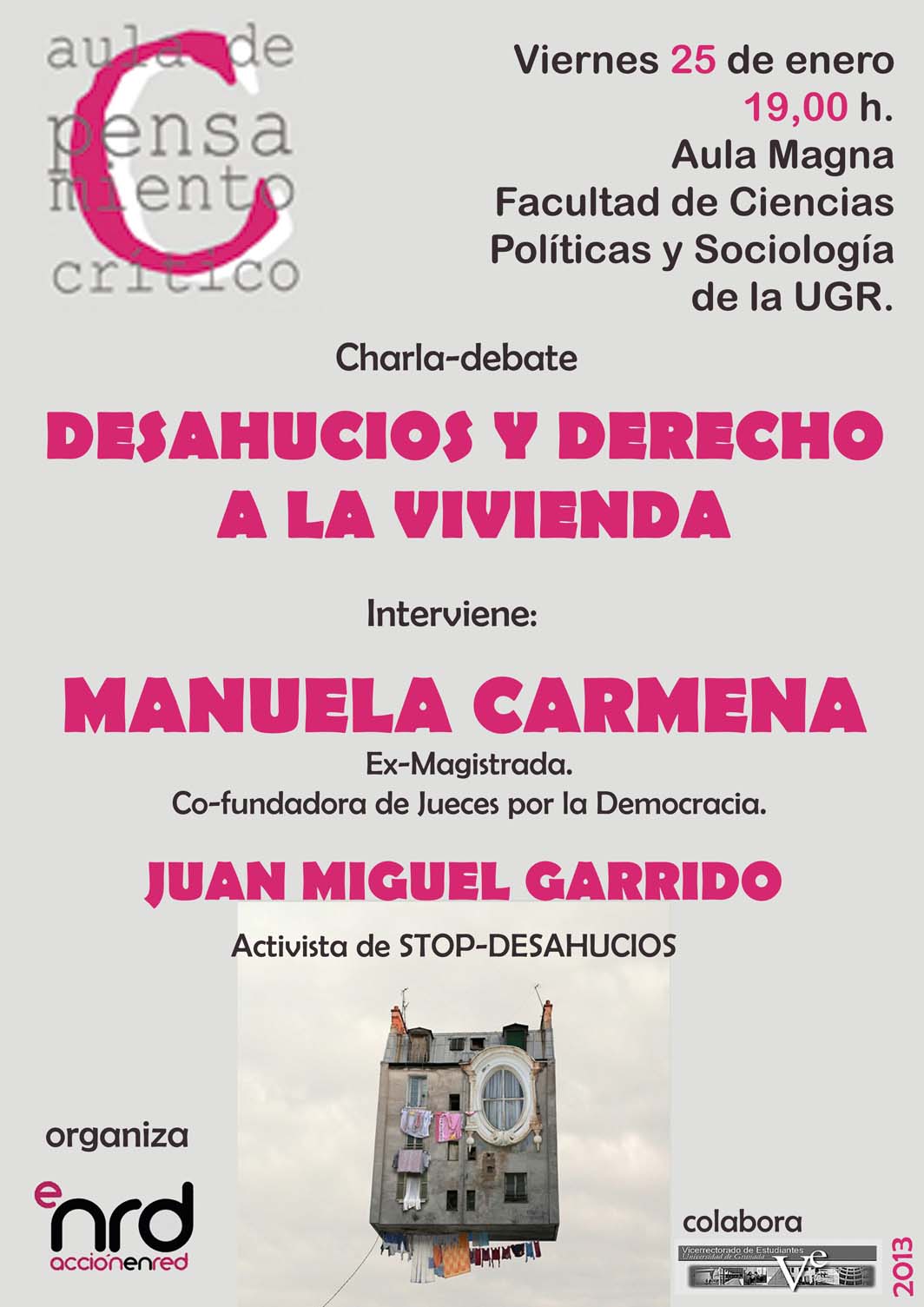 Desde acciónenred os invitamos a la próxima sesión del Aula de Pensamiento Crítico “Desahucios y derecha a la vivienda", que tendrá lugar el viernes 25 de enero, a las 19,00 horas en el Aula Magna de la facultad de Ciencias Políticas y Sociología, de la Universidad de Granada.