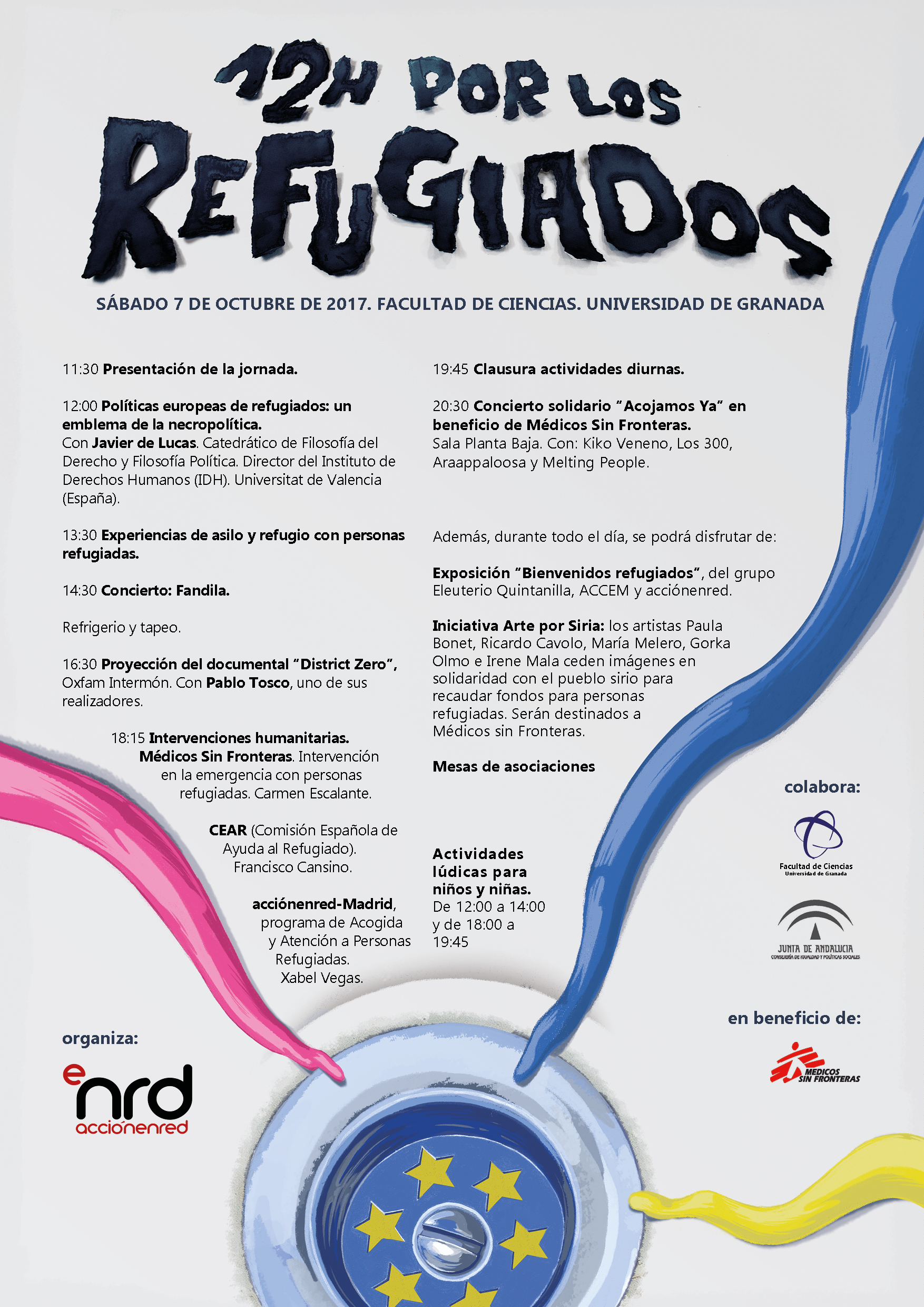 La jornada “12 horas por los refugiados” se celebraron el sábado 7 de octubre en la Facultad de Ciencias de la Universidad de Granada desde las 11:30 de la mañana y posterior concierto solidario para recaudar fondos en beneficio de Médicos Sin Fronteras. Desde las 11:30 de la mañana se ha contado con la presencia de Javier de Lucas, se han llevado a cabo mesas redondas con diferentes ONG como Médicos Sin Fronteras, CEAR o acciónenred, o la proyección del documental “District Zero”, con uno de sus realizadores Pablo Tosco y una mesa de experiencias con la presencia de Majdala, Ange y Munzir.  A esto hay que sumar las actividades infantiles, concierto de Fandila y mucho más. Todo ello con el objetivo de invitar a la sociedad a que se acerque a conocer la realidad que están viviendo las personas refugiadas y a aportar su granito de arena.