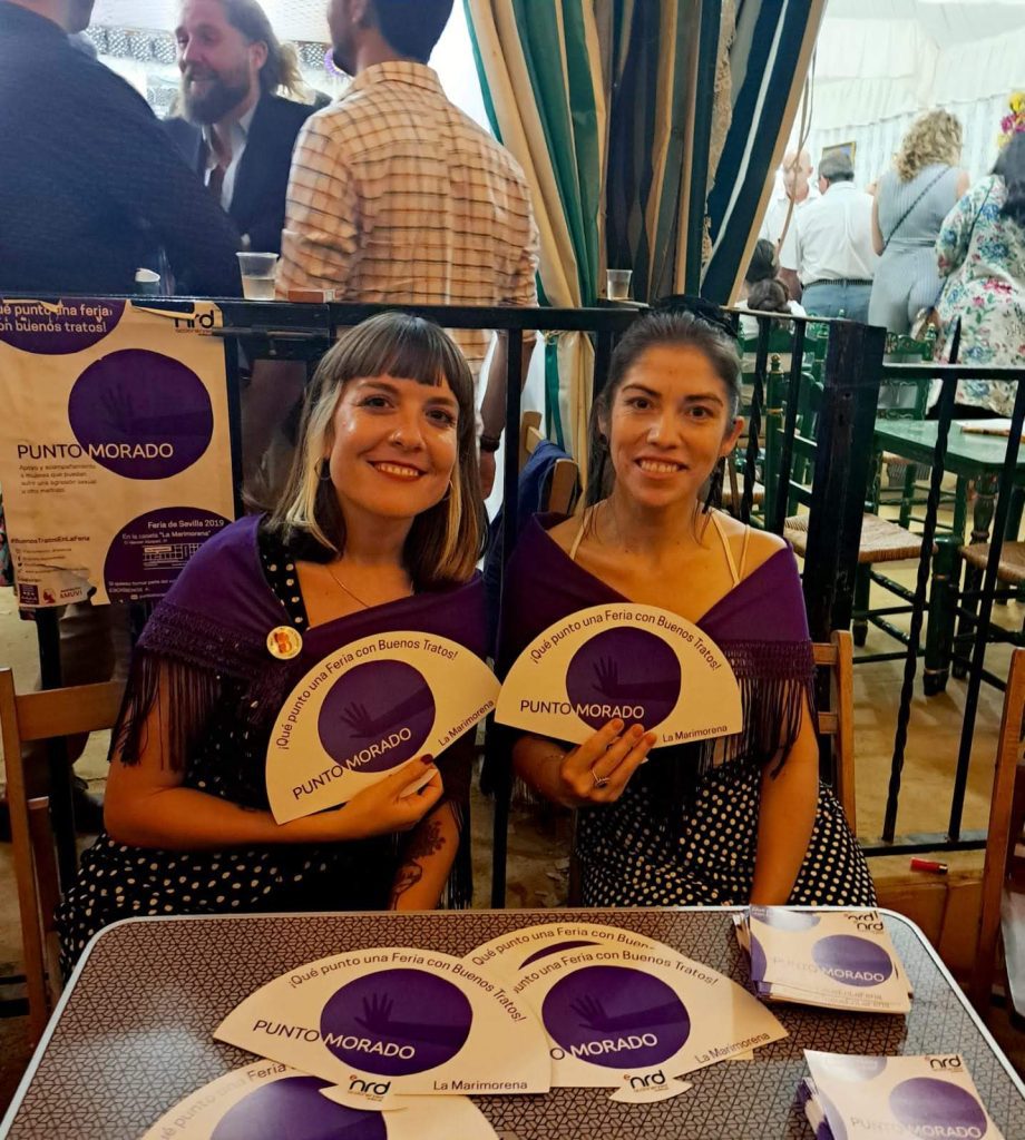 En abril instalamos en nuestra caseta de la Feria de Abril el “Punto Morado”, un lugar de recepción de mujeres que hayan sufrido agresiones sexuales en el recinto ferial, donde ser acompañadas, informadas y asesoradas. A la vez, realizamos una campaña de sensibilización sobre prevención de agresiones sexuales en contextos de ocio (más información aquí).