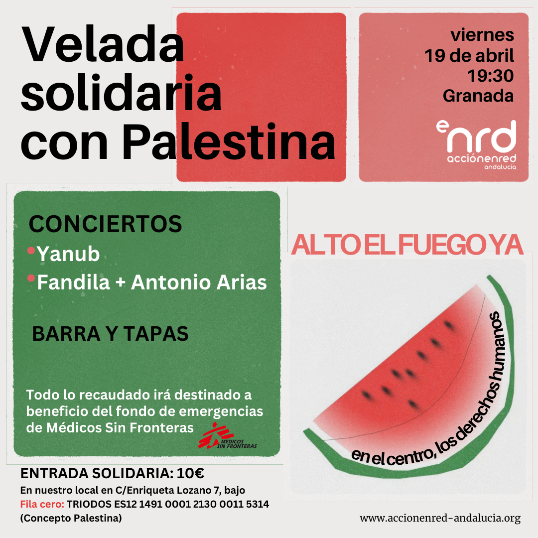 El pasado 19 de abril celebramos una velada solidaria en Granada para recaudar fondos y así aportar, en la medida de lo posible, un granito de arena ante la insoportable masacre en Palestina.