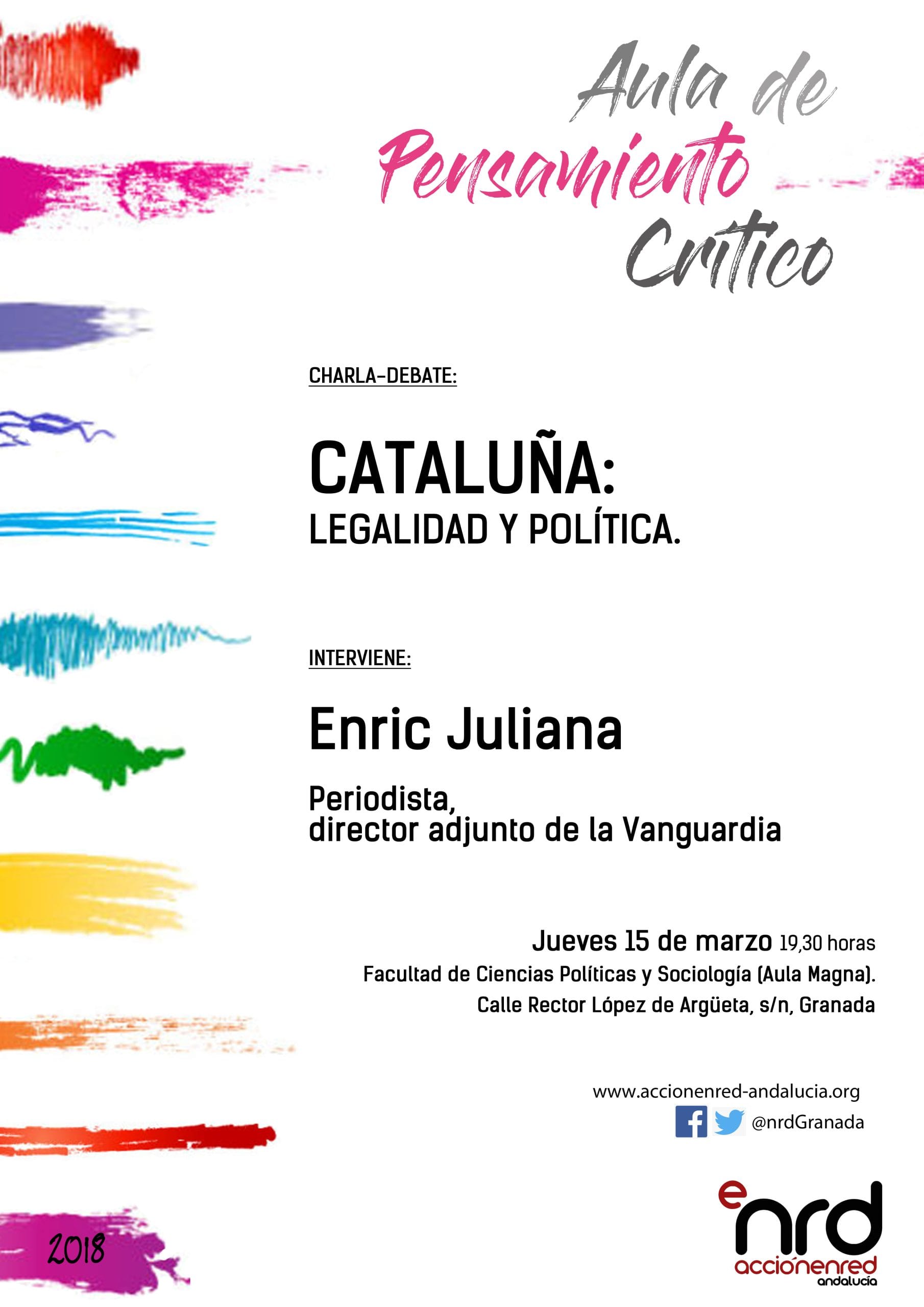 Desde acciónenred queremos invitaros a la próxima sesión del Aula de Pensamiento Crítico, "Cataluña: legalidad y política", que tendrá lugar el próximo jueves 15 de marzo a las 19:30, en el Aula Magna de la Facultad de Ciencias Políticas y Sociología, y en la que intervendrán Enric Juliana, periodista, director adjunto de la Vanguardia.