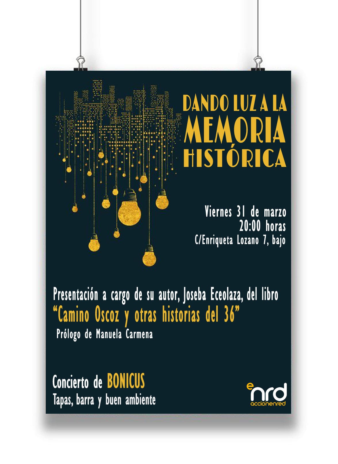 El viernes 31 de marzo, a las 20:00 horas, dedicaremos la tarde-noche a la Memoria Histórica, con la presentación del libro de Joseba Eceolaza "Camino Oscoz y otras historias del 36" (prologado por Manuela Carmena).
