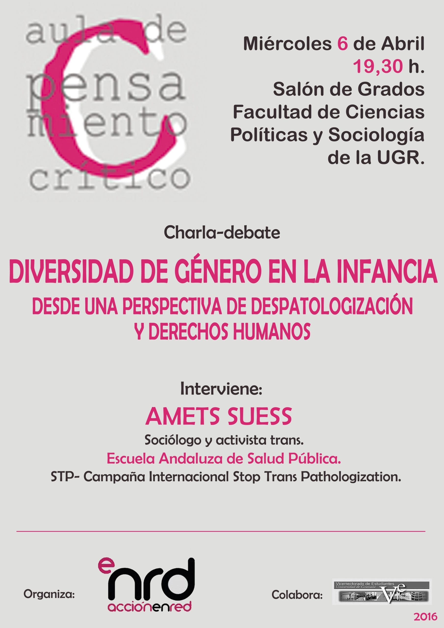 Desde acciónenred queremos invitaros a la próxima sesión del Aula de Pensamiento Crítico, "Diversidad de género en la infancia desde una perspectiva de despatologización y derechos humanos", que tendrá lugar el próximo 6 de abril a las 19:30, en el Salón de Grados de la Facultad de Ciencias Políticas y Sociología, y en la que intervendrá Amets Suess, sociólogo y activista trans, Escuela Andaluza de Salud Pública, STP- Campaña Internacional Stop Trans Pathologization.