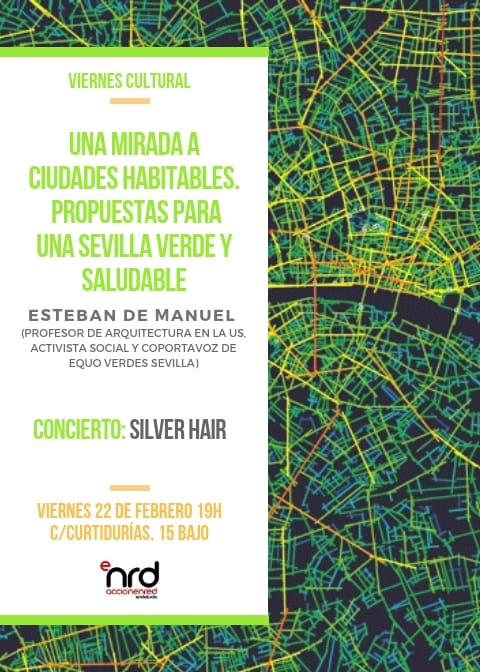 El pasado viernes 22 de febrero celebramos en Sevilla el Viernes Cultural «Una mirada a ciudades habitables. Propuestas para una Sevilla verde y habitable» de la mano de Esteban de Manuel, profesor de arquitectura en la Universidad de Sevilla, activista social y co-portavoz de Equo Verdes Sevilla.